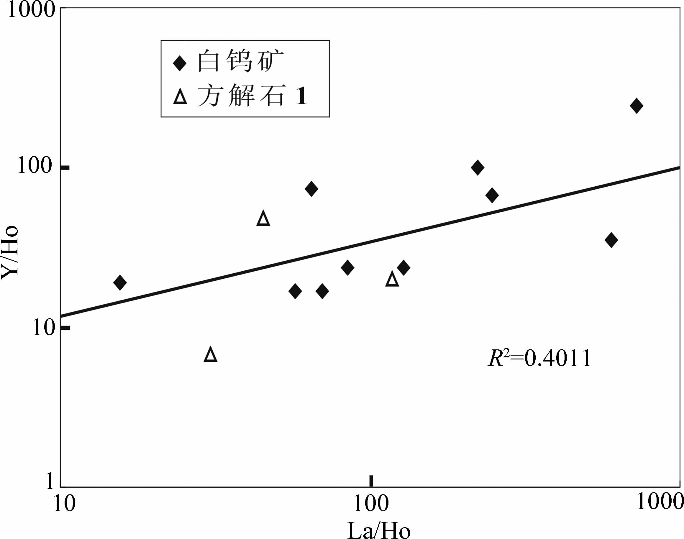Bau et al.(1995) 指出Y与F-形成络合物时表现为HREE,而与CO32-之间的络合却倾向于具有LREE的性质。本次研究的样品为萤石型矿床中的白钨矿和方解石,故成矿流体中既有F-,又有又CO32-,如果方解石中的Y以与碳酸盐络合物的形式运移,那么Y应该表现为LREE性质,即在早期方解石中富集,但是这种情况与本文的测试结果不符。本次结果表明,Y在早期方解石中的平均含量与白钨矿相当(见下文),远低于晚期方解石,明显与HREE的行为相似,这就说明其在流体运移过程中可能主要以REE-F络合物的形式存在。然而Y在运移过程中倾向于在流体之中残留的观点又与白钨矿中Y/Ho大于后期方解石的现象相矛盾。由于Y/Ho比值的大小还受制于Ho,通过对不同测试点结果的分析可得,白钨矿中Y和Ho的平均含量分别为2.06×10-6和0.04×10-6,同期方解石分别为2.56×10-6和0.06×10-6,而后期方解石中Y与Ho的含量均远高于它们,分别为13.46×10-6和0.29×10-6,而且Y和Ho在不同测试点的含量均存在很大变化,由此可知造成白钨矿中Y/Ho大于方解石的原因是其Ho含量低。从这种总趋势上看,结晶后期流体中的Y与Ho浓度均显著增加,这符合REE的不相容原理以及HREE倾向于富集在后期矿物中的趋势,但同期矿物之间以及同一颗粒不同部位Y、Ho含量的剧烈变化,反映出分异存在强烈的不均一性,导致它们的含量以及Y/Ho比值变化较大,使得数据在Y/Ho-La/Ho图中没有呈现前人通过传统溶样法研究热液萤石、方解石所得出的变化趋势。