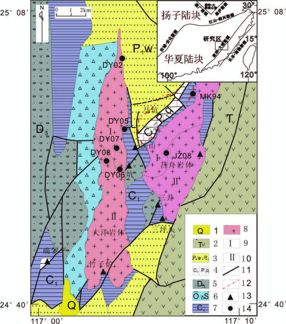 图 1 大洋和莒舟岩体地质简图(据赵一鸣等,1983修改) 1-第四系地层;2-三叠系砂岩;3-二叠系文笔山-翠屏山组砂岩;4-石炭系黄龙组-二叠系栖霞组灰岩;5-上泥盆统粉砂岩;6-奥陶-志留系变质砂岩;7-下石炭统林地组粉砂岩;8-花岗岩;9-中细粒斜长花岗岩相;10-中粗粒黑云花岗岩相;11-断层;12-马坑隐伏矿体投影;13-铁矿点;14-样品位置 Fig. 1 Simplified geologic map of the Dayang and Juzhou plutons(after Zhao et al.,1983) 1-Quaternary strata;2-Triassic sandstone; 3-Wenbishan-Chuipingshan Formation sandstone of Permian; 4-limestone of Huanglong Formation of Carboniferous and Xixia Formation of Permian;5-siltstone of Upper Devonian;6-Ordovician-Silurian metamorphic sandstone and siltstone;7-Lindi Formation quartz sandstone of Lower Carboniferous;8-granites; 9-medium-fine grained plagioclase granite; 10-medium coarse grained biotite granite; 11-fault;12-location of ore bodies at the surface;13-mineral occurrence;14-sampling position |