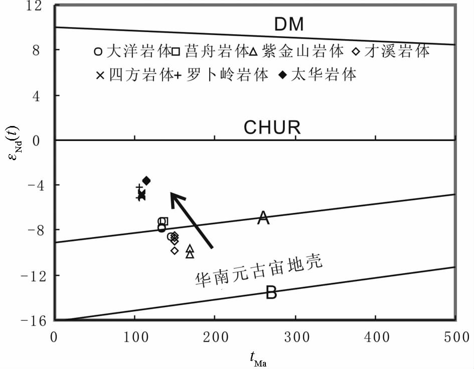 图 10 闽西南地区晚中生代花岗岩质岩体的εNd(t)-t图解 (a)-华南成熟度较低的元古宙地壳;(b)-华南成熟度较高的元古宙地壳;DM-亏损地幔;CHUR-球粒陨石均一储库;莒舟、太华岩体数据来自毛建仁等(2006) ,才溪、紫金山、四方岩体数据来自赵希林(2007) ,底图据沈渭洲等(1993) Fig. 10 εNd(t)-t diagram of Late Mesozoic granotic rocks from southwestern Fujian (a)-immature Proterozoic crust in South China;(b)-mature Proterozoic crust in South China; DM-depleted mantle; CHUR-chondritic uniform reservoir; data of Juzhou and Taihua are after Mao et al.(2006) ,Caixi,Zijinshan,Sifang are after Zhao(2007) . The base map is after Shen et al.(1993) |