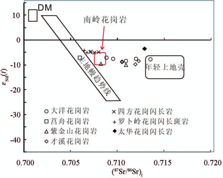 图 11 闽西南地区晚中生代花岗岩质岩体的εNd(t)-(87Sr/86Sr)ⅰ图解 DM-亏损地幔;莒舟、太华岩体数据来自毛建仁等(2006) ,才溪、紫金山、四方岩体数据来自赵希林(2007) ,南岭花岗岩数据来自Hong et al.(1998) ,底图据Jahn et al.(1999) Fig. 11 εNd(t)-(87Sr/86Sr)ⅰ diagram of Late Mesozoic granotic rocks from southwestern Fujian DM-depleted mantle; data of Juzhou and Taihua are after Mao et al.(2006) ,Caixi,Zijinshan and Sifang are after Zhao(2007) . Data of granite in Nanling Range are after Hong et al.(1998) . The base map is after Jahn et al.(1999) |