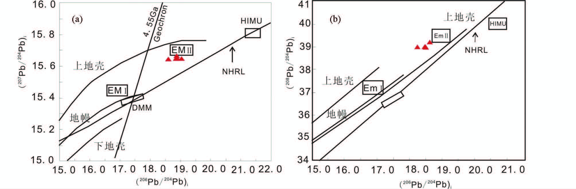 样品在清洗后,磨碎至200目。主量、微量元素和Sr、Nd、Pb同位素的分析测试在核工业北京地质研究院分析测试研究中心进行。除FeO和烧失量(LOI)采用标准湿化学分析外,其它主量元素分析采用XRF方法(X荧光光谱仪3080E),分析精度为5%,分析结果见表 3。稀土和微量元素采用ICP-MS方法分析,使用等离子质谱仪(ICP-MS-Excell),分析结果见表 4。全岩Sr、Nd、Pb同位素测试分析在热电离质谱仪上完成,仪器型号为ISOPROBE-T,分析方法详见赵海杰等(2010) ,分析结果见表 5和表 6。Sr同位素比值测定的内校正因子采用86Sr/88Sr=0.1194,标准测量结果:NBS987为0.710250±7。Nd同位素比值采用146Nd/144Nd=0.7219校正标准测量结果:SHINESTU为0.512118±3(标准值为0.512110)(赵海杰等,2010)。