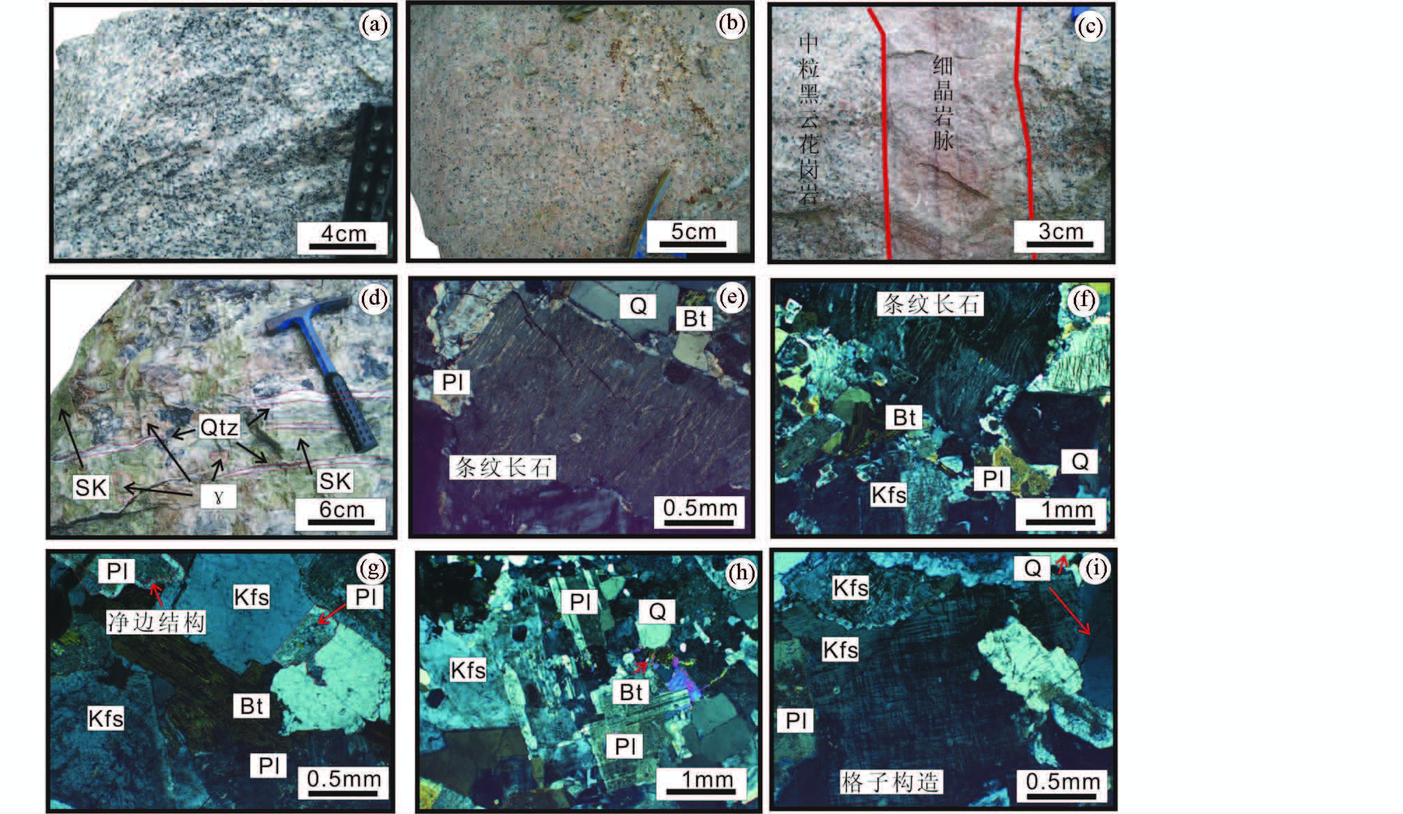 图 2 大洋-莒舟花岗岩岩石标本和显微照片 (a)-灰白色中粗粒黑云花岗岩,DY08,大洋岩体;(b)-中细粒黑云母花岗岩,DY07,大洋岩体;(c)-大洋花岗岩内细晶岩脉;(d)-矽卡岩化花岗岩,莒舟岩体;(e)-条纹长石显微照片,DY08,正交偏光;(f、g)-中粗粒黑云母花岗岩显微照片,样品DY08,正交偏光;(h、i)-中细粒黑云花岗岩显微照片,DY07,正交偏光. Kfs-钾长石;Bt-黑云母;Q-石英;Qtz-石英脉;Pl-斜长石;SK-矽卡岩;γ-花岗岩 Fig. 2 Sample photos and microphotographs of Dayang-Juzhou granite (a)-grey white medium coarse grained biotite granite,DY08,Dayang granite;(b)-pale red medium tiny grained biotite granite,DY07,Dayang granite;(c)-aplite in Dayang granite;(d)-skarnization granite,Juzhou granite;(e)-photomicrograph of perthite,by polarizing microscope with perpendicular polarized light,DY08;(f,g)-photomicrograph of medium grain biotite granite,by polarizing microscope with perpendicular polarized light,DY08;(h,i)-photomicrograph of medium tiny grained biotite granite,by polarizing microscope with perpendicular polarized light,DY07. Kfs-potassium feldspar;Bt-biotite;Q-quartz;Qtz-quartz vein;Pl-plagioclase;SK-skarn;γ-granite |