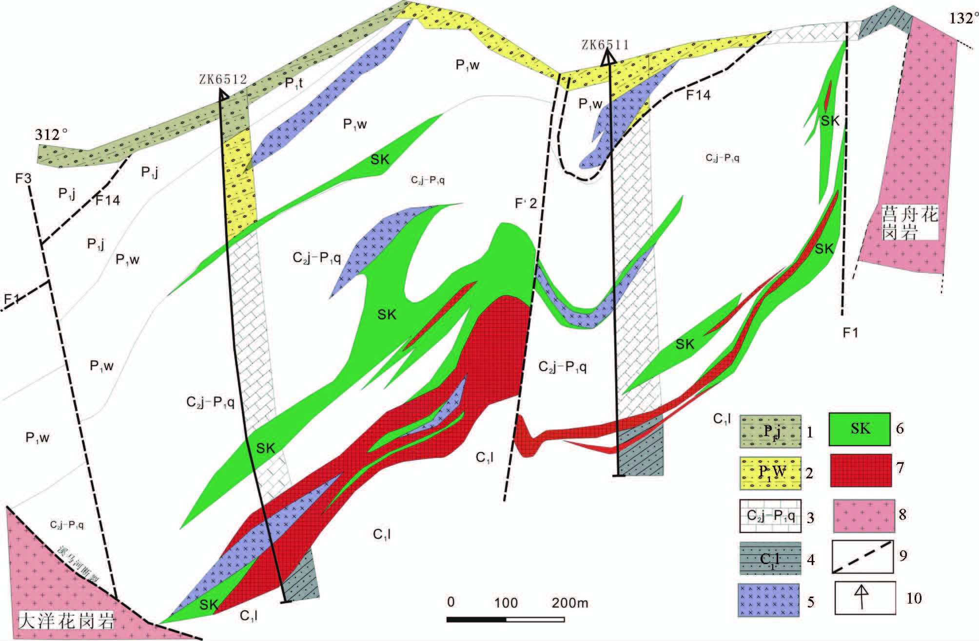 图 3 马坑铁(钼)矿床61线剖面图(据赵一鸣等,1990修改) 1-下二叠统加福组砂质页岩;2-下二叠统文笔山组页岩;3-石炭系黄龙组-二叠系栖霞组灰岩;4-下石炭统林地组石英砂岩;5-辉长-辉绿岩;6-矽卡岩;7-矿体;8-细粒微斜长石花岗岩(Ⅰ);9-断层;10-钻孔 Fig. 3 Geological section along exploration line 61 of the Makeng Fe-Mo Deposit(after Zhao et al.,1990) 1-Jiafu Formation sandy shale of Lower Permian;2-Wenbishan Formation shale of Lower Permian;3-limestone of Huanglong Formation of Carboniferous and Xixia Formation of Permian; 4-Lindi Formation quartz sandstone of Lower Carboniferous; 5-gabbro-diabase; 6-skarn; 7-ore body;8- fine grained microcline granite(Ⅰ); 9-fault; 10-drilling |