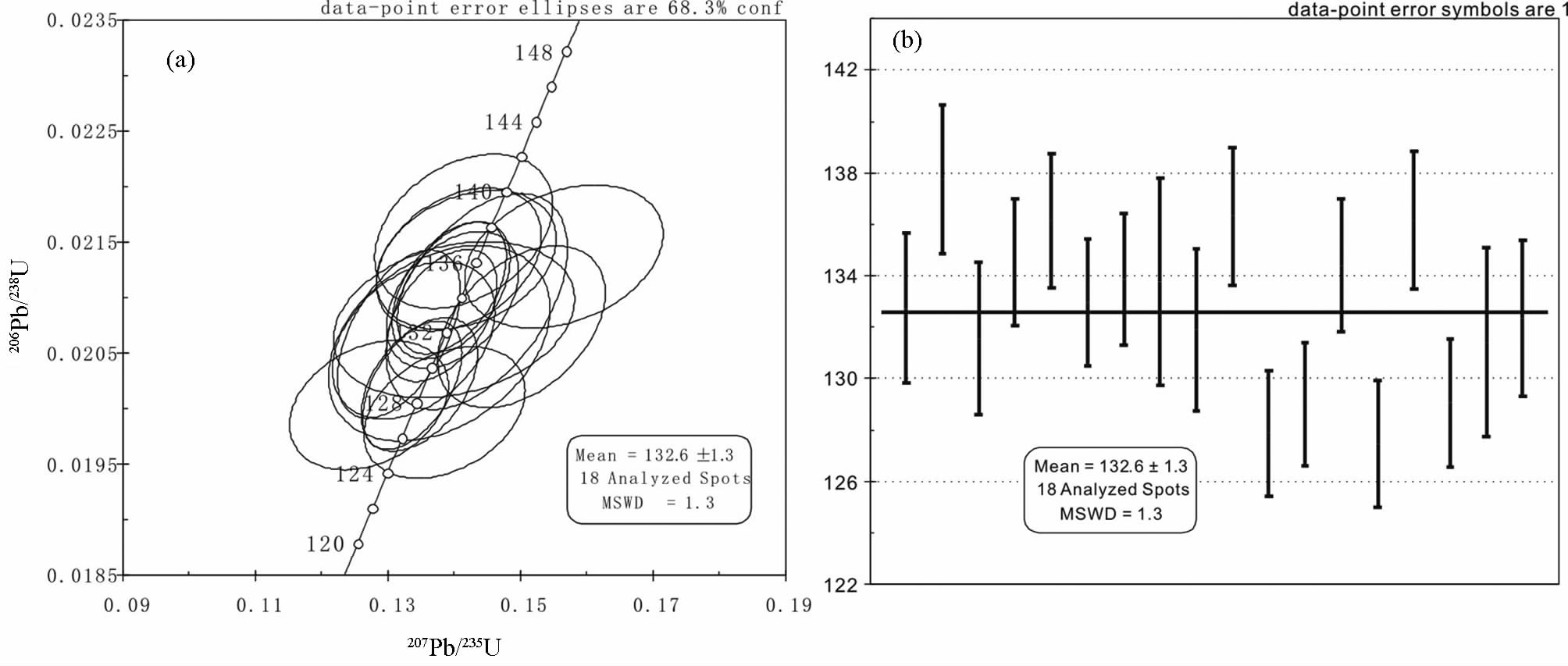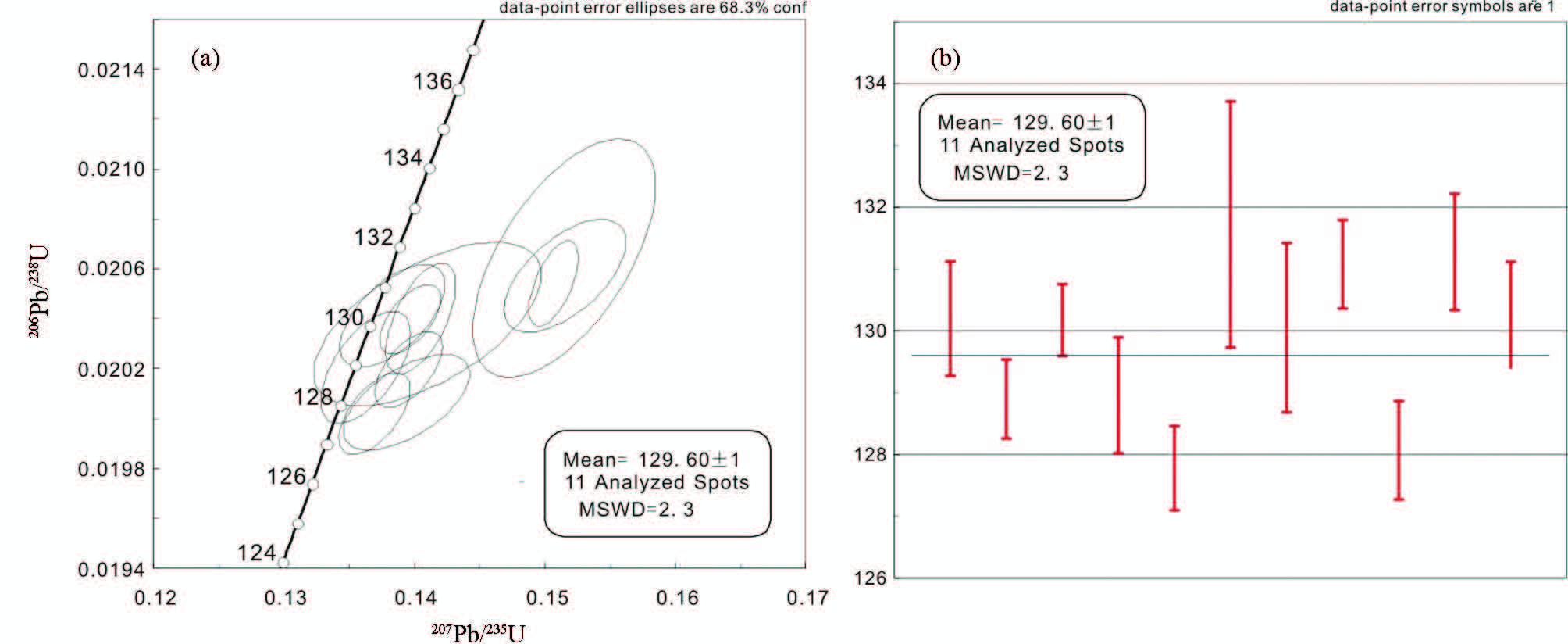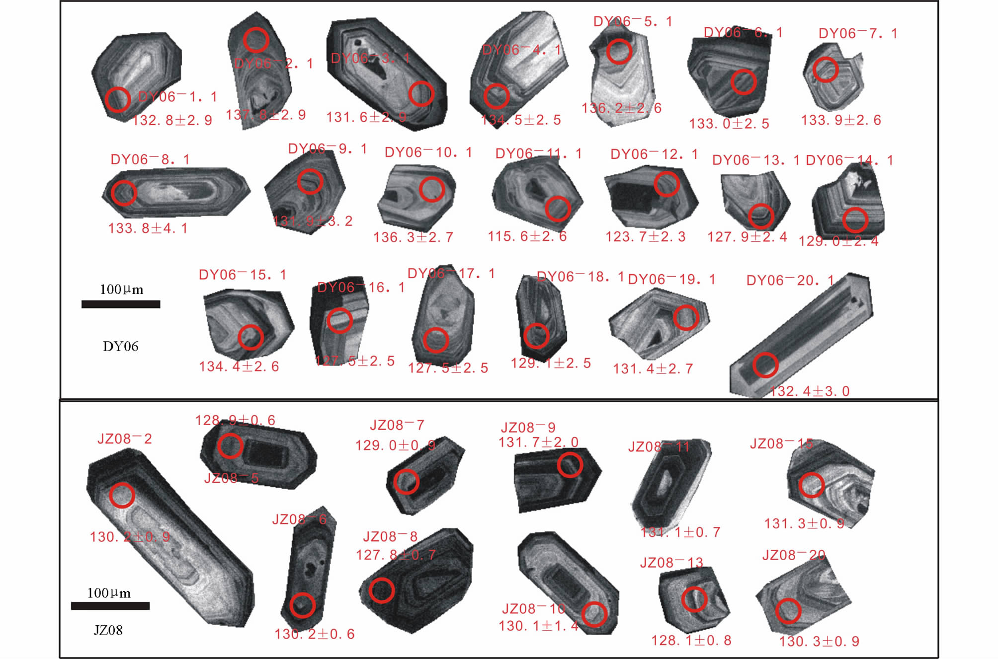 2.2 锆石特征及分析结果对大洋和莒舟花岗岩分别挑选了DY06、JZ08两个样品中的锆石进行分析。锆石为半自形到他形,有较清晰的生长环带,DY06粒径70~150μm,JZ08粒径100~200μm(图 4),表现出典型的岩浆锆石特征。本文利用SHRIMP锆石U-Pb定年法对DY06共测定了20个数据点,主要测试数据和计算结果列于表 1。其中18个粒锆石的18个点在128~136Ma之间,变化范围小,在谐和图上组成密集的一簇,说明锆石保持了良好的U-Pb封闭体系,其206Pb/238U 的加权平均年龄为132.6±1.3Ma,MSWD=1.3,其中DY06-11.1和DY06-12.1结果偏年轻,出现轻微偏离谐和线,可能是由于发生Pb丢失所致,因此舍弃这两个点的结果(图 5)。样品中锆石的U、Th含量较低,Th/U比值集中,U=252×10-6~1280×10-6,Th=208×10-6~1036×10-6,Th/U=0.54~1.44,应属岩浆成因锆石(吴元保和郑永飞,2004)。利用LA-ICP-MS锆石U-Pb定年法对JZ08样品测定了20个数据点,主要测试数据和计算结果列于表 2。其中11个粒锆石的11个点在128~131Ma之间,变化范围小,在谐和图上组成密集的一簇,说明锆石保持了良好的U-Pb封闭体系,其206Pb/238U 的加权平均年龄为129.6±0.8Ma,MSWD=2.3,其中1、12、14、19号点的结果偏年轻,出现轻微偏离谐和线,可能是由于发生Pb丢失所致;4号点(148Ma),17号点(214Ma),18号点(198Ma)的结果较大,可能为捕获锆石,故将以上9个点剔除(图 6)。样品中锆石的U、Th含量较高,U=58×10-6~878×10-6,Th=103×10-6~429×10-6,Th/U值范围与DY06类似,Th/U=0.57~1.70,也表明为岩浆成因锆石(吴元保和郑永飞,2004)。由上文可知,虽然采用不同测试方法,但DY06测试结果为132.6±1.3Ma,JZ08测试结果为129.6±0.8Ma,两者几乎一致,表明大洋岩体与莒舟岩体的成岩时代一致。