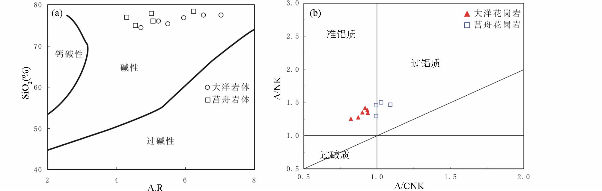 图 7 莒舟-大洋岩体的SiO2-AR关系图(a)(底图据Wright,1969)和A/CNK-A/NK图(b) Fig. 7 Diagrams of SiO2-AR(a,after Wright,1969)and A/CNK-A/NK(b)from Dayang-Juzhou pluton |