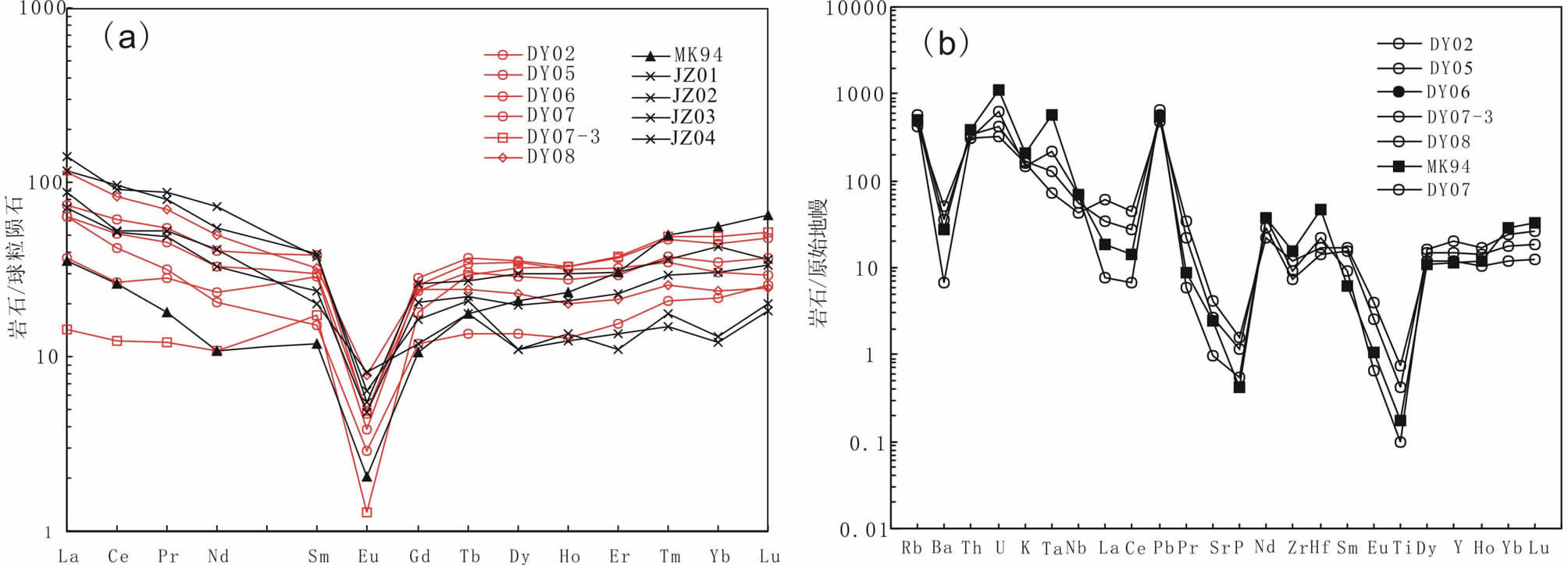 表 4 莒舟-大洋花岗岩稀土和微量元素含量表(×10-6) Table 4 Rare earth and trace elements compositions(×10-6)of Juzhou-Dayang pluton |