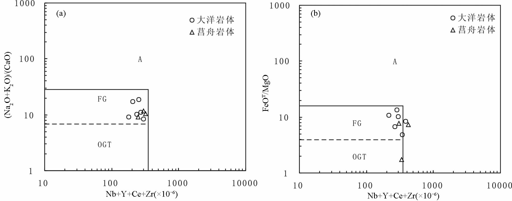 图 9 大洋岩体Zr+Nb+Ce+Y和(Na2O+K2O)/CaO、FeOT/MgO图解(底图据Whalen et al.,1987) Fig. 9 Diagrams of Zr+Nb+Ce+Y and(Na2O+K2O)/CaO,FeOT/MgO for the Dayang pluton(after Whalen et al.,1987) |