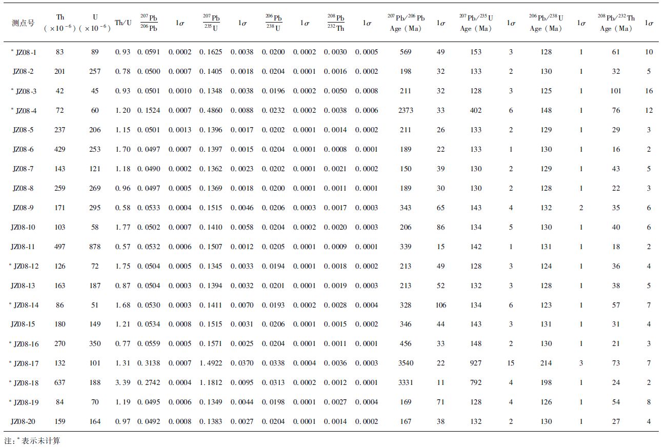 表 2 莒舟花岗岩体样品JZ08中锆石LA-ICP-MS的U-Pb同位素定年结果 Table 2 LA-ICP-MS U-Pb isotpic dating results of zircons of sample JZ08 from Juzhou granite |