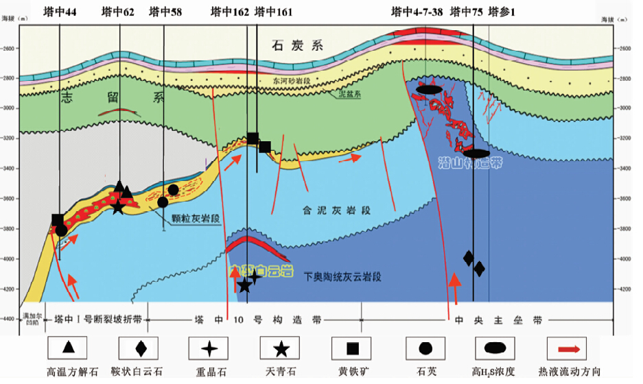 图 1 TZ44-TZ62-TZ58-TZ162-TZ75-TC1剖面热液/埋藏溶蚀流体运移示意图 Fig. 1 Diagram of hydrothermal/burial dissolution fluid migration on cross-section TZ44-TZ62-TZ58-TZ162-TZ75-TC1 |