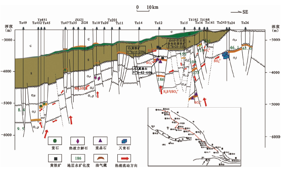 沿Ⅰ号断裂带的NW-SE向剖面显示(图 2),沟通基底与奥陶系地层的断裂发育为埋藏热液溶蚀流体的向上运移提供优势运移通道。该类型流体的上涌同样导致了奥陶系储层中热液矿物的沉淀以及TSR反应的发生。最新的研究显示(Cai et al.,2009),研究区TSR的发生可能有两期(图 2):早期TSR发生在寒武系-下奥陶统地层内,所产生的H2S δ34S范围为25‰~29‰,沿断裂向上运移,最终以裂缝充填物形式分布在奥陶系,或成层状分布在志留系;晚期TSR是由热液流体携带中寒武统SO42-进入上奥陶统储层中,并与遇到的烃类发生反应。相对于烃类来说过量的SO42-的存在使得TSR反应过程中硫同位素发生分馏,并导致产生的H2S具有低δ34S值(15‰~20‰),而反应残余的SO42-沉淀为重晶石,则具有重硫同位素值特征(42‰~44‰)。