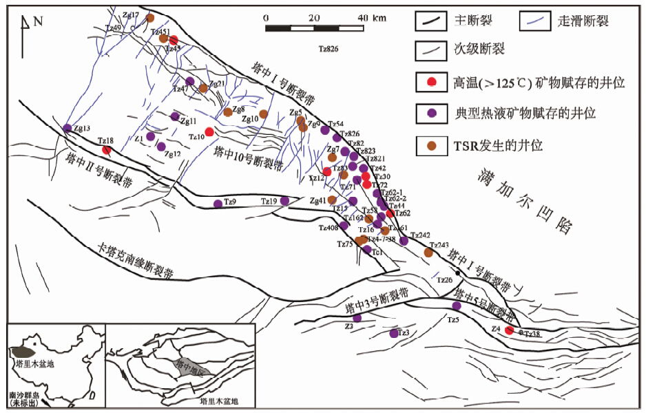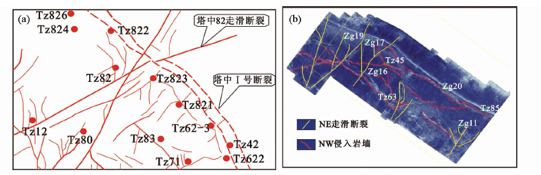 (1)走滑断裂发育的部位(平面上断裂密度大)往往是热液井位集中分布的地区。如TZ45井区具负花状构造特征的走滑断裂发育使得该井区成为深部热流体优选的注入点(图 5b),从而形成O3l大型的萤石洞层(王嗣敏等,2004;张兴阳等,2006);TZ82井区同样识别出与塔中Ⅰ号带近于垂直的走滑断裂(图 5),也是深部热流体优选的改造区(潘文庆等,2009)。(2)远离Ⅰ号带的热液井位多分布于走滑断裂附近,且展布方向与断裂走向一致(图 2)。以TZ83及TZ12井区为例,尽管远离1号带,但受控于NE-SW向走滑断裂带的分布(图 5a),二者井段均存在明显的埋藏热流溶蚀体活动迹象:TZ83井油气藏中H2S浓度高达3.75%,并产生丰富的黄铁矿以及2-硫代金刚烷和C10-C34 四氢噻吩系列等TSR标志性含硫化合物(Jiang et al.,2008; Cai et al.,2009);TZ12井区同样可见重晶石、萤石及丰富的黄铁矿(表 1);典型的TSR特征以及热液矿物与Ⅰ号带附近分布的TZ82、TZ821以及TZ826等井相似(图 4b)。(3)走滑断裂发育与深部热流体活动时间吻合,以往研究显示(贾承造,2004;李明杰等,2006),除晚加里东期外,该组走滑断裂在二叠纪继续活动,沟通了基底与二叠纪地层;尽管目前还没有直接可信的热液矿物年龄数据报道,二叠纪广泛的热事件无疑将增大上下层间温度差,促进热流体的循环对流及上涌(Wood and Hewett,1982),因此对于塔中地区而言,北东-南西向走滑断裂的活动对二叠纪时期大规模的热液流体运移具有重要意义。