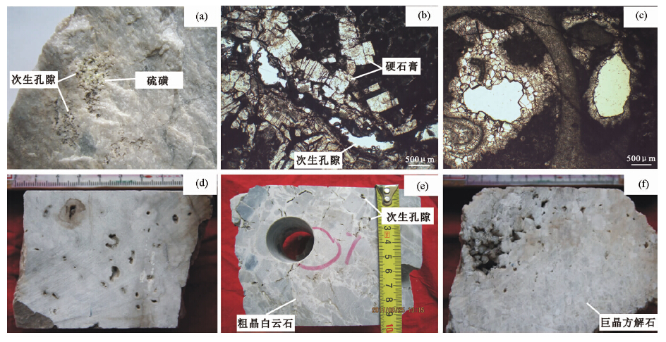 图 4 塔中地区奥陶系碳酸盐岩储层的热液改造现象 (a)-白云岩表面次生孔隙及伴生的硫磺,TZ243,O1p,5717m(距O3l/O1-2y不整合面310m);(b)-硬石膏晶体被溶蚀,TZ826,O3l,5743.5m(距S/O不整合面1151m),单偏光;(c)-埋藏方解石胶结物被溶蚀,TZ826,O3l,5694.5m(距S/O不整合面1102m),单偏光;(d)-砂屑灰岩表面丰富的溶蚀孔洞,TZ42,O3l,5554.3m(距S/O不整合面1108m);(e)-灰岩角砾间充填粗晶白云石,角砾表面次生溶孔、溶缝发育,TZ408,O1p,4037.2m;(f)-溶洞巨晶方解石表面发育规模不一的次生孔隙,TZ3,O1-2y,3908m Fig. 4 Photographs showing hydrothermal effect on the Ordovician carbonate reservoirs in Central Tarim (a)-solution pores in dolomite with sulfur associated in Well TZ243,O1p,5717m(310m away from the S/O unconformity),PL;(b)-dissolution pores in anhydrite crystals,TZ826,O3l,5743.5m(1151m away from the S/O unconformity),PL;(ac)-dissolution pores in burial calcite cement,TZ826,O3l,5694.5m(1102m away from the O3l/O1-2y unconformity);(d)-abundant dissolution pores and vugs in calcarenite,TZ42,O3l,5554.3m(1108m away from the S/O unconformity);(e)-precipitation of coarse cystalline dolomite in inter-breccia porosities and the appearance of secondary porosity on the surface of breccias,TZ408; O1p,4037.2m;(f)-porosity impovement by dissolution in karst-filling calcites,TZ3,O1-2y,3908m |