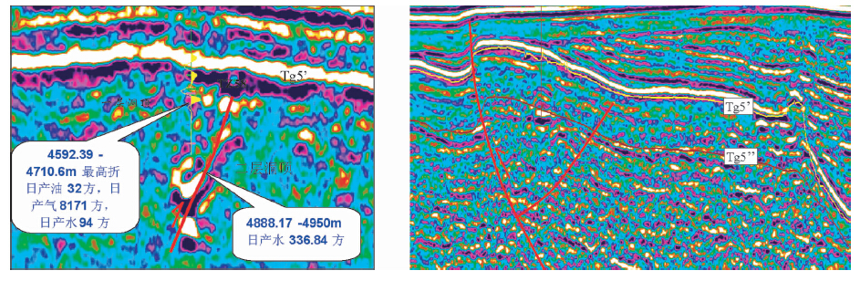 图 6 TZ58井附近断裂沟通O3l上下两套洞穴层(a)和TZ69井附近断裂以及奥陶系溶洞体系发育剖面图(b) Fig. 6 Map of two sets of cave systems crossed by a fault located near well TZ58(a)and a photograph showing the faults and cave systems near well TZ69(b) |