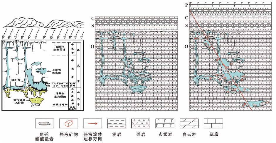 基于塔中地区埋藏热液溶蚀流体分布、流动方向及运移通道等方面的认识,并结合研究区实际地质概况,本次研究提出如下碳酸盐岩储层的形成与演化模式(图 7):源于深部地层的埋藏热液溶蚀流体在向上运移过程中,将沿着优势运移通道(走滑断裂)注入储层。流体携带的大量热能及酸性物质(如H2S及CO2等)将促使围岩矿物发生溶解或交代作用(Nedkvitne et al.,1993;Machel,2004),为深部优质储层段的形成提供条件。随后深部流体继续向低压力区运移,并进入加里东/海西期表生岩溶作用形成、但遭到后期埋藏压实破坏的残余溶洞体系进行溶蚀改造,使得被压缩的溶洞空间得以改善,从而形成现今良好的油气储存空间。