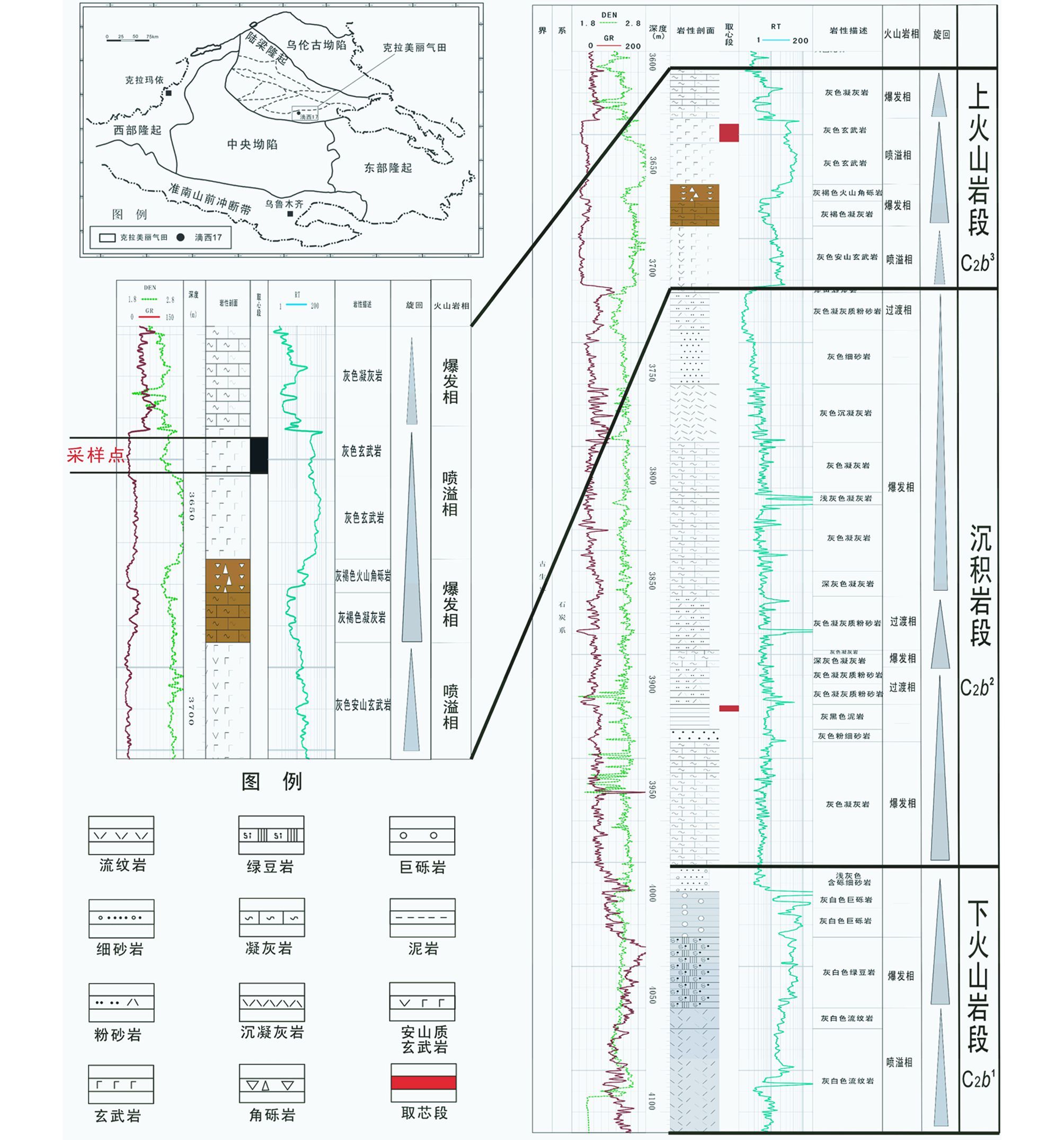 从盆地的形成及演化来看,准噶尔盆地主要经历了海西、印支、燕山及喜马拉雅四期构造运动,由于各期构造运动在区内表现形式及强弱的不同,造成了地层的分布及构造特征存在一定的差异。石炭纪的构造演化表现为:在早晚石炭世都经历了拉张-挤压的演化阶段。通过研究区内钻井资料显示(王东良等,2008),以及东侧克拉美丽山地层的出露情况来看,本区发育的最古老地层为泥盆系,向上还发育有石炭系塔木岗组、滴水泉组、巴塔玛依内山组(以下简称巴山组)以及石钱滩组,其内部均为不整合接触。塔木岗组为一套含陆源碎屑物质和火山碎屑物质的滨海-海陆交互相沉积;滴水泉组为一套含陆源碎屑物质的浅海沉积;巴塔玛依内山组为一套含火山碎屑物质夹陆源碎屑物质的海陆交互相沉积;石钱滩组为一套含陆源碎屑物质的海相和陆相沉积(况军,1993)。巴塔玛依内山组在盆地内部克拉美丽地区滴西17井中也发育,分为三个亚组:下巴山组岩性以中酸性岩类为主,目前钻遇131m厚;中巴山组岩性为中酸性岩类的凝灰质粉砂岩、细砂岩、凝灰岩、以及少量的黑色泥岩;上巴山组岩性为中基性的玄武岩、安山质玄武岩,中间夹有少量的凝灰岩和火山角砾岩,主要以基性岩类为主。
