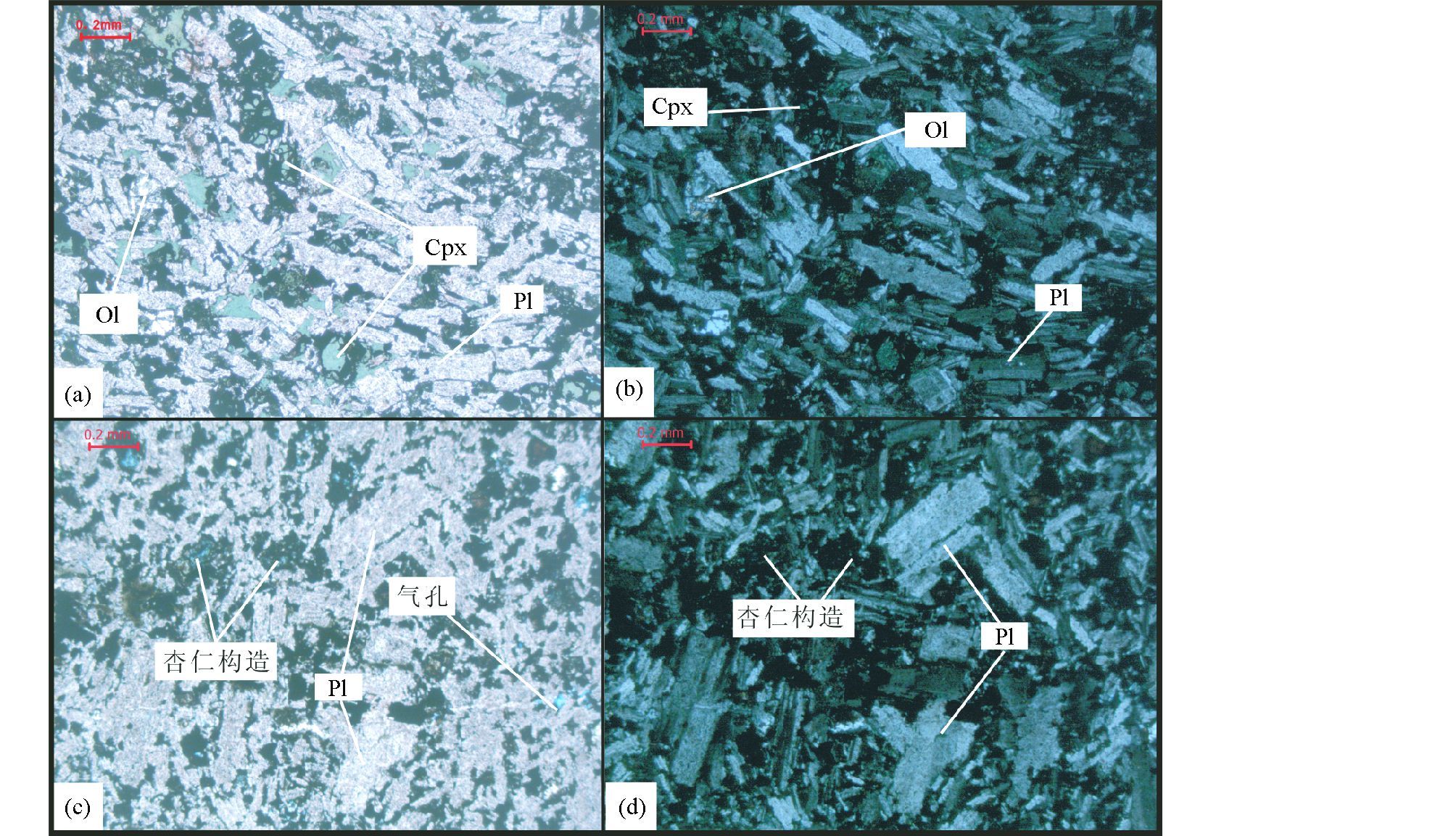 图 2 克拉美丽气田石炭系玄武岩岩相学特征 (a)-滴西17井3634~3636m,玄武岩镜下辉石蚀变较强;(b)-滴西17井3634~3636m,可见橄榄石颗粒;(c)-滴西17井3640~3642m,气孔构造明显;(d)-滴西17井3640~3642m,斜长石斑晶呈不规则柱状,杏仁构造发育.Cpx-单斜辉石;Pl-斜长石;Ol-橄榄石.(a、c)-单偏光;(b、d)-正交偏光 Fig. 2 Petrography features of Carboniferous basalt in Karamaili gas field (a)-3634~3636m in well-Dixi17,basalt is alterated strongly in the microscope;(b)-3634~3636m in well-Dixi17,olivine grain can be seen;(c)-3640~3642m in well-Dixi17,air voids is obvious;(d)-3640~3642m in well-Dixi17,plagioclase phenocrysts show irregular,almond tectonic development. Cpx-clinopyroxene; Pl-plagioclase; Ol-olivine.(a,c)-plane-polarised light;(b,d)-crossed-polarised light |