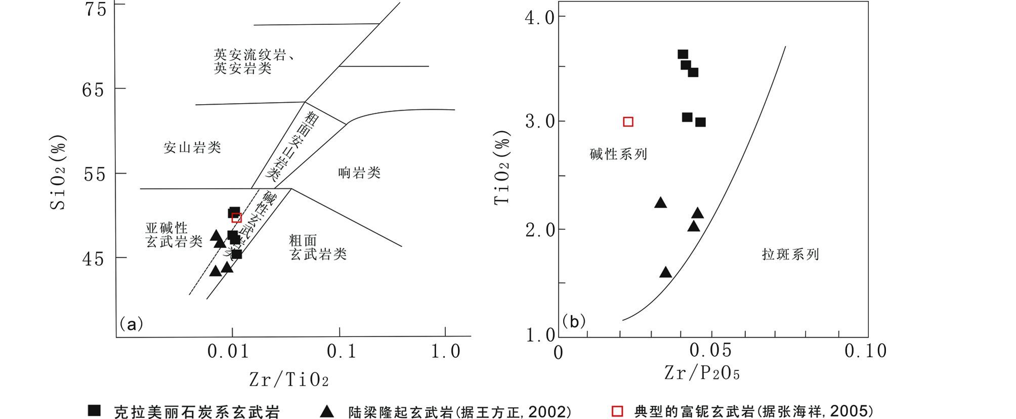 图 3 克拉美丽气田石炭系玄武岩主量元素地球化学特征 (a)-火山岩SiO2-Zr/TiO2岩石分类图解(据Winchester and Floyd,1977);(b)-火山岩的TiO2-Zr/P2 O5图解(据Winchester and Floyd,1976) Fig. 3 Major element features of Carboniferous basalt (a)-SiO2-Zr/TiO2 categories diagram of volcanic rock(after Winchester and Floyd,1977);(b)-TiO2-Zr/P2 O5 diagram of volcanic rock(after Winchester and Floyd,1976) |