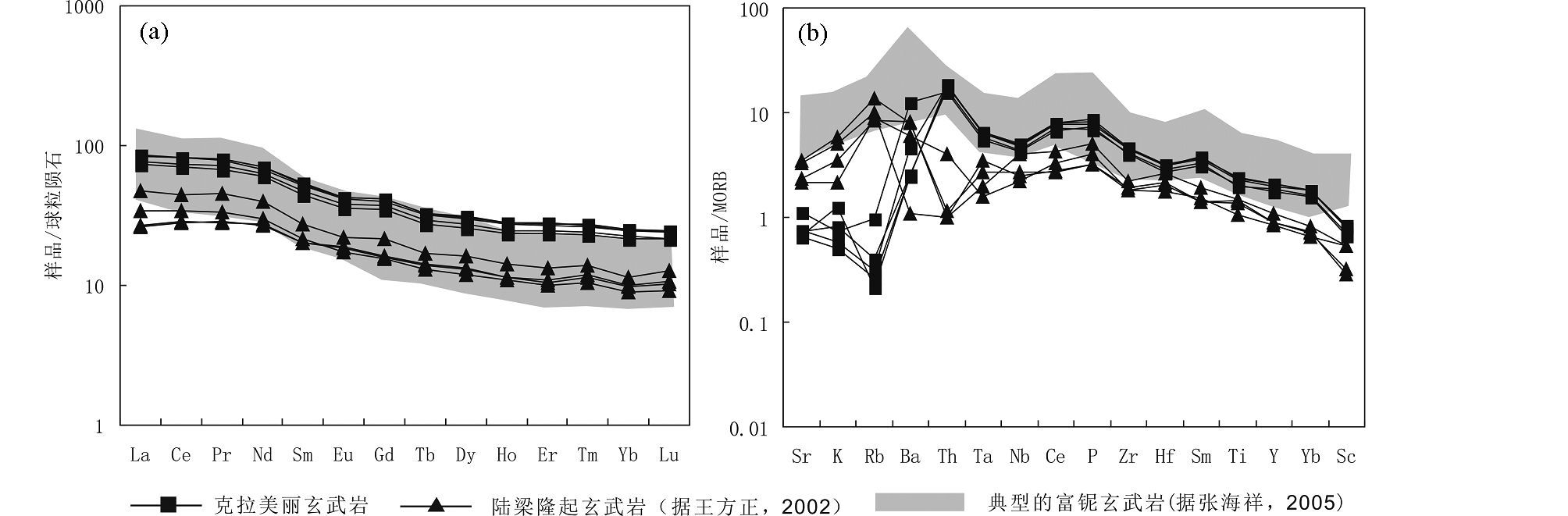 陆梁隆起是准噶尔盆地北部的一个大型的断裂隆升带,呈北西向展布,东部与克拉美丽蛇绿岩带相接,向西延伸至达尔布特蛇绿岩带,整个克拉美丽-三个泉-达尔布特东西相带可能构成了一条隐伏的地壳拼接带(况军,1993;翟光明等,2002;何登发等,2005)。以往的研究多借助于沉积、重磁等手段,尚缺少断隆带拼合性质的地球化学证据。通过与陆西地区石炭系火山岩的对比研究,克拉美丽气田石炭系玄武岩具有陆梁隆起中部地区火山岩(王方正等,2002)具有相似的地球化学特征,从而验证了盆地北部板内裂谷火山岩的带状分布特征。