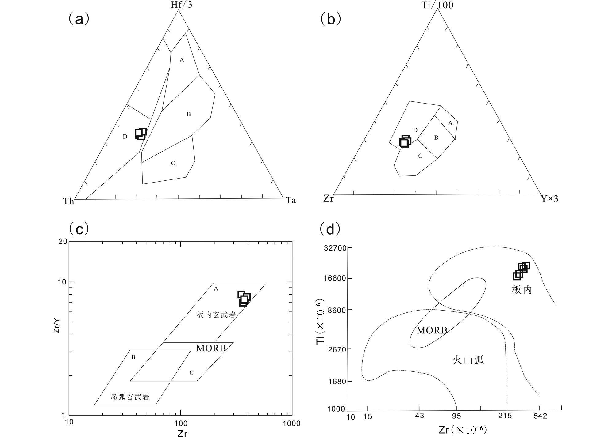图 5 克拉美丽气田石炭系玄武岩微量元素构造判别图解 (a)-Hf-Th-Ta图解(据Pearce,1990):A-亏损型洋中脊拉斑玄武岩;B-富集型洋中脊拉斑玄武岩;C-板内碱性玄武岩;D-岛弧玄武岩;(b)Ti-Zr-Y图解(据Pearce,1990):D-板内玄武岩; B-洋中脊玄武岩;A和B-岛弧拉斑玄武岩;B和C-钙碱性玄武岩;(c)-Zr/Y-Zr构造判别图解(据Pearce and Norry,1979);(d)-玄武岩Ti-Zr构造环境判别图(据Pearce,1982) Fig. 5 Tectonic setting discrimination diagram with trace elemental plots of basalt (a)-diagram of Hf-Th-Ta(after Pearce,1990):A-depleted mid-oceanic ridge tholeiite;B-Enriched mid-oceanic ridge tholeiite;C-within-plate alkaline basalt;D-island arc basalt;(b)-diagram of Ti-Zr-Y(after Pearce,1990):D-within-plate basalt;B-mid-oceanic ridge basalt;A and B-island arc tholeiite;B and C-Calc-alkaline basalt;(c)-tectonic discrimination diagram of Zr/Y-Zr(after Pearce and Norry,1979);(d)-tectonic setting discrimination diagram of basalt Ti-Zr(after Pearce,1982) |