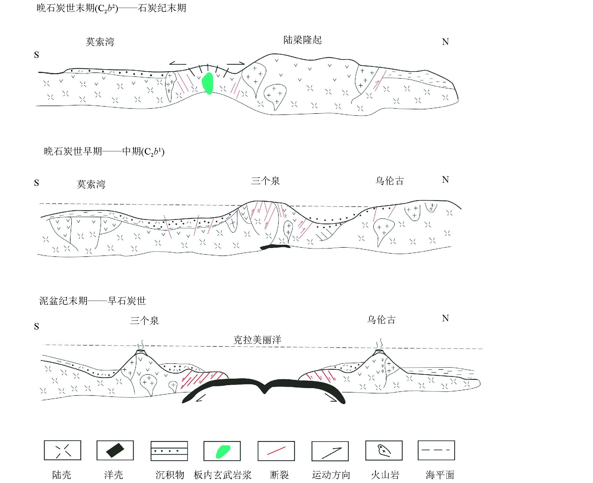 克拉美丽地区玄武岩的研究为揭示了准噶尔盆地石炭纪构造演化提供了新的证据(图 6),在早石炭世,盆地内部克拉美丽残余洋盆仍处于收缩阶段,洋壳继续向南北两侧俯冲,分别在三个泉地区(另文发表)和乌伦古地块南缘(Yang et al., 2011) 形成火山弧。已有的地质研究资料表明,克拉美丽蛇绿岩带中含有早石炭世的放射虫化石(李锦轶等,1990;舒良树和王玉净,2003),此外,石炭纪晚期的花岗质岩基切穿了蛇绿岩带,由此可推断克拉美丽洋盆应该在早石炭世末期关闭(李锦轶,1995)。在晚石炭世早期到晚石炭世巴山组下火山岩段(C2b1)形成的阶段,随着克拉美丽洋的关闭,南北两侧板块的碰撞使岩石圈不断的增厚,在此期间,莫索湾岛弧带逐渐向南迁移,同时在莫索湾岛弧带与三个泉岛弧带之间形成弧间残余陆表海。在晚石炭世巴山组沉积期(C2b2)形成海相沉积,由此在巴山组沉积岩段形成了一套黑色泥岩。晚石炭世巴山组上火山岩段形成时期(C2b3),在断陷作用下岩石圈减薄,使上地幔物质熔融诱使地壳出现断裂形成“裂谷带”,陆梁隆起中部地区的双峰式火山岩可能是后碰撞伸展环境下代表性的产物。