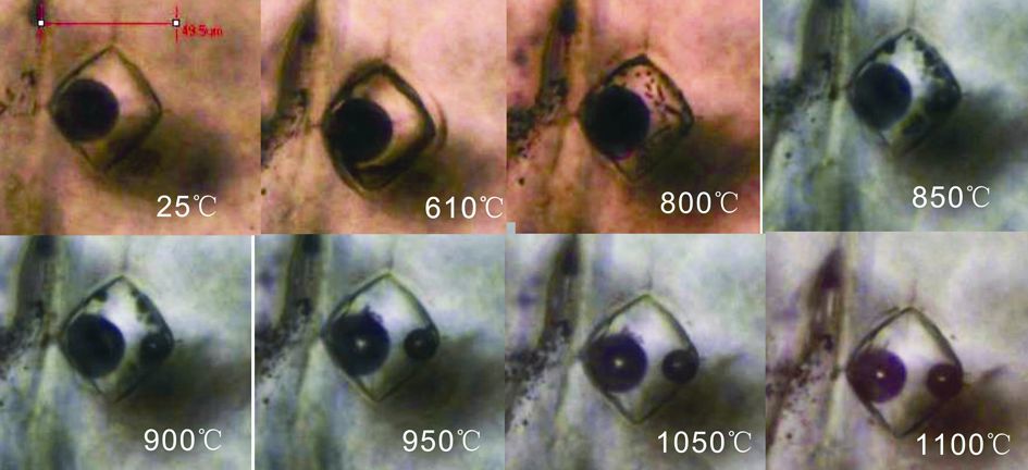 图 5 石英斑晶中玻璃质熔体包裹体的加热变化 Fig. 5 Heating characteristics of a glassy melt inclusion in quartz phenocryst |