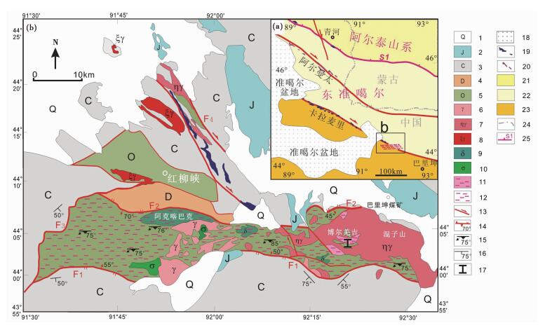 图 1 红柳峡韧性剪切带位置(a)与分布图(b)(据新疆地质调查院, 2001①修编) 1-第四系;2-侏罗系沉积岩;3-石炭系沉积岩;4-泥盆系火山岩;5-奥陶系火山岩;6-未变形花岗岩;7-二长花岗岩;8-碱性花岗岩;9-闪长岩;10-辉长岩与辉绿岩;11-糜棱岩化花岗岩;12-红柳峡韧性剪切带;13-走滑断层;14-逆断层;15-片理产状;16-地层产状;17-图 3剖面位置;18-晚古生代蛇绿岩;19-早古生代蛇绿岩;20-准噶尔盆地;21-阿尔泰造山带;22-东准噶尔地体;23-准噶尔地块;24-国界线;25-缝合带与编号. S1-鄂尔齐斯-蒙古中央线缝合带 Fig. 1 Location (a) and distribution (b) of the Hongliuxia ductile shear zone 1-Quaternary sediments; 2-Jurassic sedimentary rocks; 3-Carboniferous sedimentary rocks; 4-Devonian volcanic and sedimentary rocks; 5-Ordovician volcanic rocks; 6-undeformed granite; 7-monzonitic granite; 8-alkali granite; 9-diorite; 10-gabbro and diabase; 11-mylonitic granite; 12-the Hongliuxia ductile shear zone; 13-slide fault; 14-reverse fault; 15-attitude of foliation; 16-attitude of bedding; 17-location of the profile shown in figure 3; 18-Late Paleozoic ophiolite belt; 19-Early Paleozoic ophiolite belt; 20-Junggar basin; 21-Altaids; 22-East Junggar terrain; 23-Junggar block; 24-National boundary; 25-suture and number. S1-the Erqis-Main Mongolian Lineament suture |