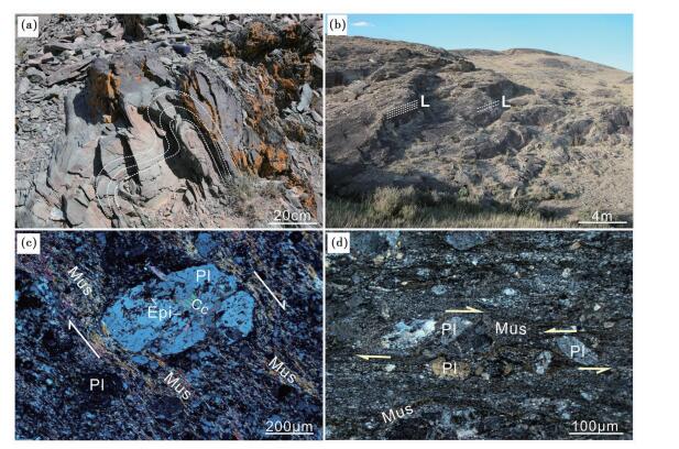 图 2 片岩中的A型褶皱与阿克喀巴克闪长岩的变形特征 (a)-片岩中的A型褶皱;(b)-片理化的闪长岩, 虚线示拉伸线理构造;(c, d)-闪长质糜棱岩中的旋转碎斑构造.图片(a)与(b)中虚线分别示片理与线理构造, 图片(c)与(d)中箭头示剪切变形方向. Cc-方解石;Pl-斜长石;Epi-绿帘石;Mus-白云母 Fig. 2 photographs showing A-type fold in schist (a) and foliated diorite in the Akekabake area (b), and polarized microscopic images (c and d) showing σ-structures from dioritic mylonites The dashed lines in image (a) and (b) show foliations and stretching lineation respectively, while the arrows in image c and d indicate shear sense. Cc-calcite; Pl-plagioclases; Epi-epidote; Mus-muscovite |