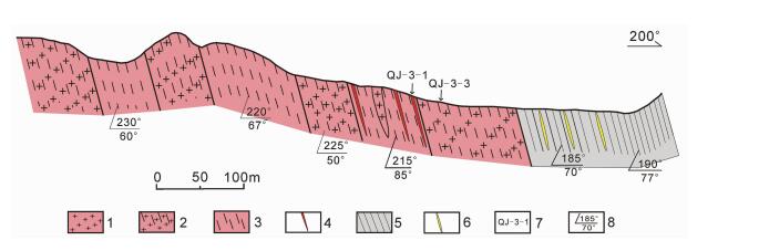 图 3 博尔羌吉糜棱岩化花岗岩构造剖面图 1-花岗岩;2-糜棱岩化花岗岩;3-花岗质糜棱岩;4-超糜棱岩条带;5-道草沟群绿泥石片岩;6-石英脉;7-采样点号;8-片理产状 Fig. 3 Tectonic profile of Boerqiangji foliated granite 1-granite; 2-foliated granite; 3-granitic mylonite; 4-stripped ultra-mylonite; 5-chlorite schist of the Daocaogou Group; 6-quartz vein; 7-sample number; 8-attitude of schistosity |