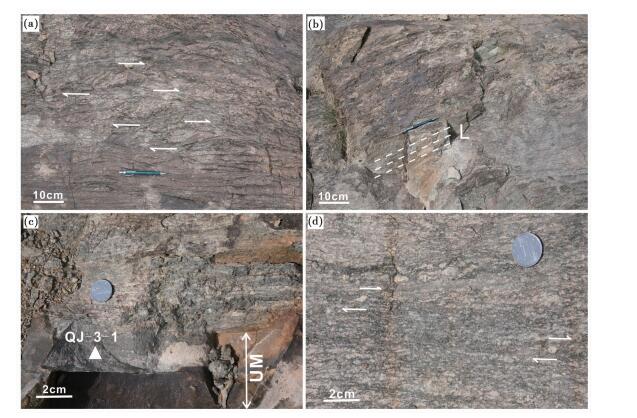 图 4 博尔羌吉花岗质糜棱岩-超糜棱岩露头照片 (a)-糜棱岩化花岗岩中的透镜体与S-C构造;(b)-花岗质糜棱岩中片理与线理构造;(c)-超糜棱岩(UM)与糜棱岩;(d)-糜棱岩中的旋转碎斑.图片(c)中三角与编号示超糜棱岩测年样品采样位置与编号 Fig. 4 Field photographs showing granitic mylonites and ultra-mylonites in the Boerqiangji area Image (a) showing lenticular and S-C structure, while image (b) for foliation and lineation in foliated granite, image (c) for ultra-mylonites (UM) and mylonites, and image (d) for σ-structures in mylonites. The triangle and label in image c show location and number of ultra-mylonites for zircon SIMS U-Pb dating |