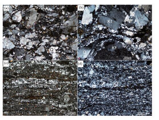 图 5 博尔羌吉糜棱岩化花岗岩与花岗质糜棱岩显微照片 (a)-花岗岩;(b)-糜棱岩化花岗岩;(c)-花岗质糜棱岩;(d)-超糜棱岩.Q-石英;Kf-钾长石 Fig. 5 Polarized microscopic images of granitic mylonites in the Boerqiangji area (a)-granite; (b)-foliated granite; (c)-granitic mylonite; (d)-ultra-mylonite. Q-quartz; Kf-K-feldspar |