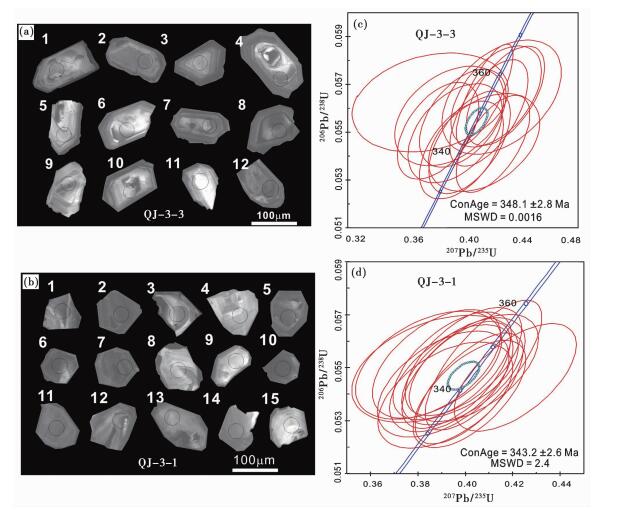 U、Th、Pb的测定在中国科学院地质与地球物理研究所CAMECA IMS-1280二次离子质谱仪(SIMS)上进行, 详细分析方法见Li et al.(2009)。锆石标样与锆石样品以1︰3比例交替测定。U-Th-Pb同位素比值用标准锆石Plésovice (337Ma, Sláma et al., 2008)校正获得, U含量采用标准锆石91500 (81×10-6, Wiedenbeck et al., 1995)校正获得, 以长期监测标准样品获得的标准偏差(1SD=1.5%, Li et al., 2010)和单点测试内部精度共同传递得到样品单点误差, 以标准样品Qinghu (159.5Ma, Li et al., 2009)作为未知样监测数据的精确度。普通Pb校正采用实测204Pb值。由于测得的普通Pb含量非常低, 假定普通Pb主要来源于制样过程中带入的表面Pb污染, 以现代地壳的平均Pb同位素组成(Stacey and Kramers, 1975)作为普通Pb组成进行校正。同位素比值及年龄误差均为1σ。数据结果处理采用ISOPLOT软件(Ludwig 2001)。图 6(a, b)分别为博尔羌吉糜棱岩化花岗岩与花岗质超糜棱岩锆石的CL图像。糜棱岩化花岗岩(样品QJ-3-3)锆石, 其长度在87~200μm之间, 宽度为59~90μm, 长宽比为1.2~2.9, 锆石主要呈短柱状、不规则六边形或八边形(四方双锥{111}面很发育), 也有部分长柱状者;无色、透明, 内部裂纹发育, 晶形较好, 部分锆石碎裂或边部有溶蚀现象;多具有核和清晰的韵律环带, CL图像呈灰白色, 为典型的岩浆锆石(Corfu et al., 2003)。花岗质超糜棱岩(样品QJ-3-1)锆石长度在100~163μm之间, 宽度为53~100μm, 长宽比为1.23~2.25;多呈长柱状、短柱状、不规则多边形;内部环带构造不发育或不明显, CL图像呈灰色;大部分锆石具相对规整的外形、其中部分具隐约的环带构造, 这意味着其为变质过程由岩浆锆石变质结晶形成的锆石;岩石中还发育少量不规则他形锆石, 其内部环带不发育, 为变质过程新形成锆石。花岗质超糜棱岩锆石与花岗岩中的锆石相比, 大部分具有相似的大小、外形与晶体形态, 含相对较多变质重结晶锆石以及新生的他形锆石。