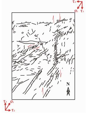 白垩纪晚期-新近纪的伸展构造 (图 15), 广泛分布于塔北隆起的大部分地区。一系列小规模的正断层平面上雁列状分布, 组成近NNE向和NEE向两组正断层带。右旋剪切形成的近NNE走向的张扭行正断层带和左旋剪切形成的NEE走向的张扭性正断层带, 组成一个共轭断层系。该断层系的主压应力σ1方向为NE-SW, 相应的最大主张应力σ3的方向是NW-SE, 表明研究区在白垩纪晚期-新近纪经受NW-SE向的拉张作用。σ1分解出两个剪应力, NS向剪应力τ1小于EW向剪应力τ2, 说明当时研究区在东西方向上经受左行剪切作用。