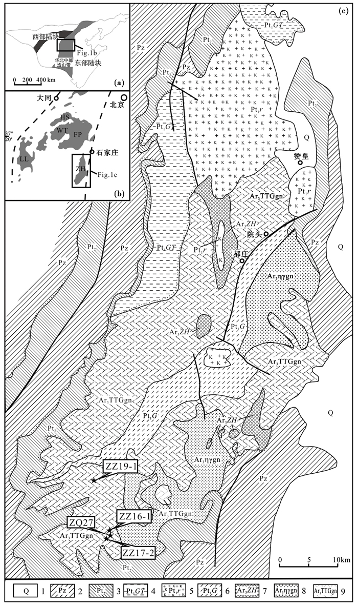 图 1 华北克拉通前寒武纪地质简图(a)、赞皇变质杂岩在华北中部造山带的构造位置图(b, 据Zhao et al., 2001b) 和赞皇变质杂岩地质简图及采样点位置(c, 据杨崇辉等, 2011) Fig. 1 Geological sketch map of the North China Craton (a), showing location of the Zanhuang metamorphic complex in the Trans-North China Orogen (b, after Zhao et al., 2001b) and the geological sketch map of the Zanhuang metamorphic complex, including representative sample locations (c, after Yang et al., 2011) |