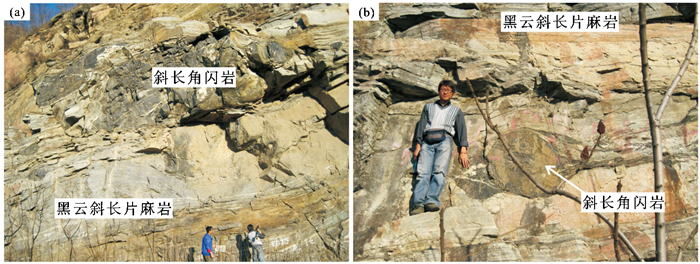 图 2 斜长角闪岩以“透镜状”方式产出于黑云斜长片麻岩中 Fig. 2 Lens-like amphibolites intercalates with biotite-bearing plagioclase gneisses |