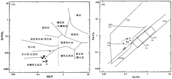 4件斜长角闪岩样品的SiO2含量介于46.92%~52.51%, Al2O3含量较高(12.60%~15.75%), TiO2含量相对较低(0.90%~1.74%)。全铁Fe2O3T含量变化于15.38%~18.61%之间, 全碱ALK (Na2O+K2O) 为1.60%~4.75%。元素比值Zr/TiO2-Nb/Y图解(图 4a, Winchester and Floyd, 1977) 中, 所有样品均落在亚碱性玄武岩附近区域。结合野外产状特征及先前研究成果(肖玲玲和蒋宗胜, 2010), 推测该斜长角闪岩的原岩为亚碱性玄武质岩石。样品的Mg#=51~68, 反映岩浆经历了一定程度的结晶分异演化, 可能发生过铁镁质矿物的结晶分离。其中, 样品ZQ27的Mg#最高(表 1), 相对接近原始岩浆成分。
