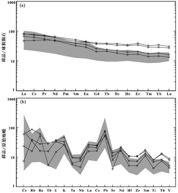 图 5 赞皇西南部斜长角闪岩的稀土元素配分模式图(a) 和微量元素蛛网图(b)(标准化值据Sun and McDonough, 1989) 实线数据来自本文, 阴影部分数据来自肖玲玲和蒋宗胜(2010) Fig. 5 Chondrite-normalized REE distribution pattern (a) and primitive mantle-normalized pattern spidegram (b) of trace elements of amphibolites in the southwest area of the Zanhuang complex (normalization values after Sun and McDonough, 1989) Data of solid lines from this paper, data of shadow parts from Xiao and Jiang (2010) |