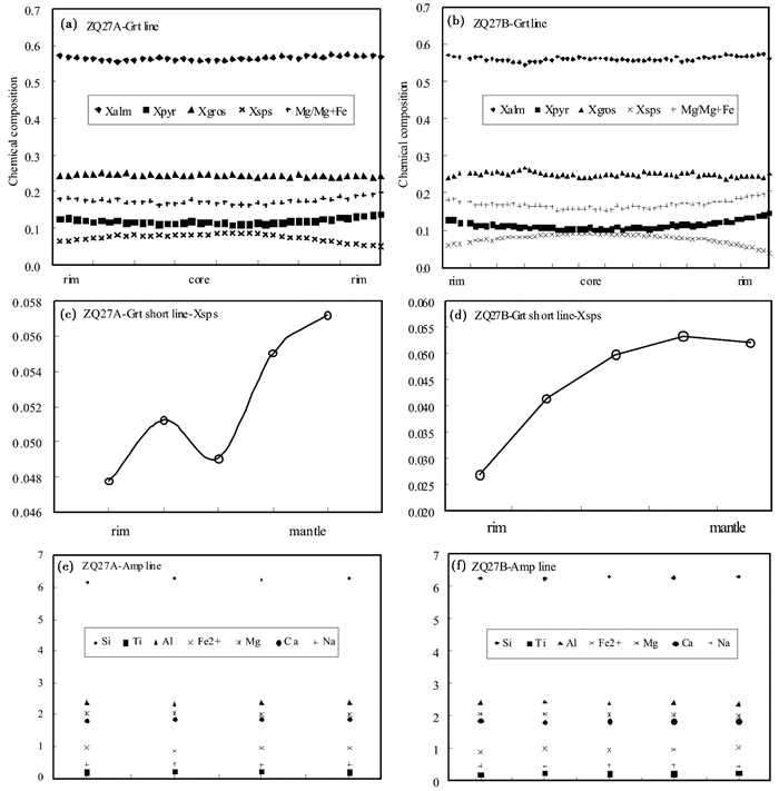 图 6 含榴斜长角闪岩样品ZQ27中矿物的化学成分剖面 (a)-微区A的石榴石成分剖面, 长2.70mm;(b)-微区B的石榴石成分剖面, 长3.34mm;(c)-微区A的石榴石边部成分剖面, 长0.29mm;(d)-微区B的石榴石边部成分剖面, 长0.36mm;(e)-微区A中邻近石榴石的基质角闪石成分剖面, 长0.43mm;(f)-微区B中邻近石榴石的基质角闪石成分剖面, 长0.47mm Fig. 6 Chemical profiles of the minerals in garnet-bearing amphibolite sample ZQ27 (a)-a 2.70mm long chemical profile of garnet in microdomain A; (b)-a 3.34mm long chemical profile of garnet in microdomain B; (c)-a 0.29mm long chemical profile of garnet rim in microdomain A; (d)-a 0.36mm long chemical profile of garnet rim in microdomain B; (e)-a 0.43mm long chemical profile of garnet-adjacent amphibole, in microdomain A; (f)-a 0.47mm long chemical profile of garnet-adjacent amphibole in microdomain B |