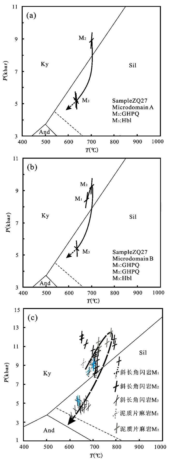 ZQ27微区B:对早期进变质作用阶段(M1) 采用角闪石-斜长石温度计(Holland and Blundy, 1994) 和石榴石-角闪石-斜长石-石英(GHPQ) 压力计(Dale et al., 2000) 获得其变质温度和压力分别为679℃、8.4kbar;对峰期阶段(M2) 矿物组合同样采用角闪石-斜长石温度计(Holland and Blundy, 1994) 和石榴石-角闪石-斜长石-石英(GHPQ) 压力计(Dale et al., 2000) 获得该阶段的变质温压为701℃、9.3kbar;退变质(M3) 矿物组合采用角闪石单矿物温压计(Gerya et al., 1997) 获得其变质温度和压力为636℃、5.4kbar。