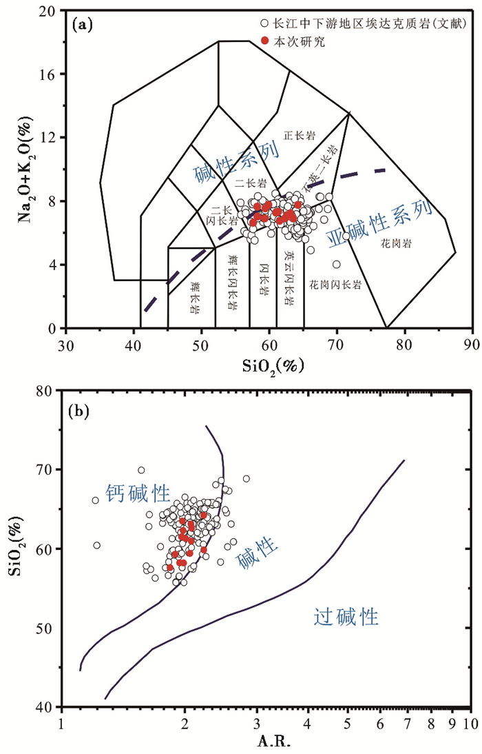 表 2 铜陵地区埃达克质岩主量和微量元素组成(主量元素:wt%;稀土和微量元素:×10-6) Table 2 Major and trace elements compositions of the adakitic rocks in the Tongling region (Major elements: wt%; Trace elements: ×10-6) |