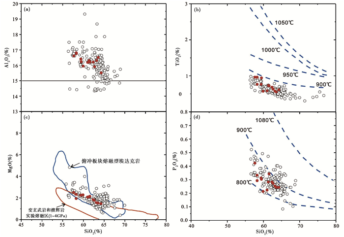 图 3 铜陵地区埃达克质岩哈克图解 TiO2,P2O5温度演化线来自Harrison and Watson (1984),Green and Pearson (1986);板块熔融型埃达克岩、变玄武岩和榴辉岩实验熔融区引自Defant and Kepezhinskas (2001).长江中下游地区埃达克质岩数据同图 2 Fig. 3 Harker diagrams for the adakitic rocks from Tongling area Temperature evaluation based on TiO2, P2O5 after Harrison and Watson (1984), Green and Pearson (1986), respectively. The fields of adakites from slab melting in subduction zone and experimental metabasalt and ecogite melts (1~4Ga) after Defant and Kepezhinskas (2001). Data sources for LYRB adakitic rocks are the same as in Fig. 2 |