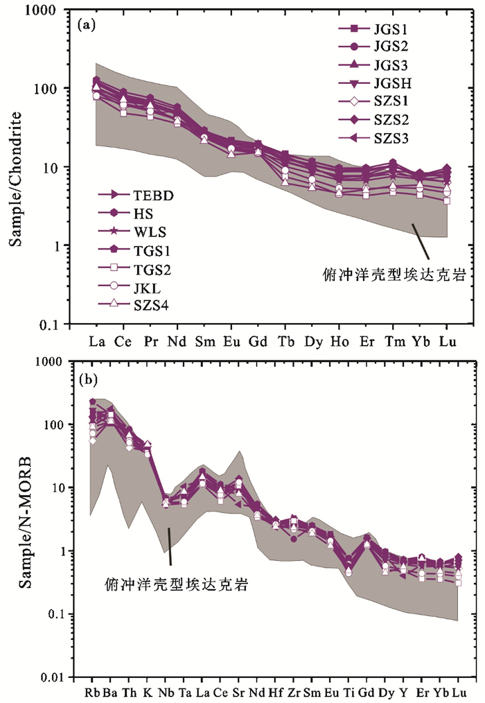 铜陵埃达克质岩样品稀土总量变化为121×10-6~205×10-6,(La/Yb)N值在12.1~17.7之间,反映轻重稀土分异明显(表 2)。球粒陨石标准化稀土配分模式显示具有一致的相对富集轻稀土和近平滑的重稀土配分模式,带有弱负Eu异常(平均Eu*/Eu=0.88)(图 4a)。在N-MORB标准化微量元素图解中,铜陵埃达克质岩显示具有Sr元素正异常,亏损Nb、Ta、Ti元素的相似的配分曲线(图 4b)。稀土配分模式和N-MORB标准化图解反映出与Austral火山带俯冲洋壳熔融型埃达克岩特征一致(Stern and Kilian, 1996;图 4a,b)。