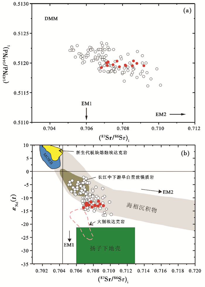 铜陵地区埃达克质岩样品Sr、Nd同位素数据见表 3。从表中可看出,这些样品的Rb、Sr、Sm和Nd含量变化范围分别为30.7×10-6~128×10-6、483×10-6~1247×10-6、4.85×10-6~6.61×10-6和24.7×10-6~40.1×10-6。其Nd、Sr同位素组成有较大的变化范围:初始(87Sr/86Sr)i变化在0.7068~0.7092,εNd(t) 变化在-11.3~-13.7,与长江中下游地区埃达克质岩相似(图 5;陈江峰等,1993;周涛发等,2001;Xu et al., 2002;王强等, 2002, 2003;王元龙等,2004;Wang et al., 2004a, b,2006,2007a;高庚等,2006;杨小男等,2007;李进文等,2007;蒋少涌等,2008;李亮和蒋少涌,2009;Xie et al., 2008;Li et al., 2008, 2009;Liu et al., 2010)。从图 5可以看出,所有样品呈负线性排列,趋向于EM2端元,明显不同于加厚或拆存下地壳而来的大别低镁和高镁埃达克岩(Wang et al., 2007b;Huang et al., 2008;Ling et al., 2011),大都落在海相沉积物区域内(Hofmann,2003),反映出沉积物在岩浆源区的重要作用(图 5b)。此外,铜陵及长江中下游地区埃达克质岩同位素特征相似于受俯冲板块而来的熔体或流体交代的岩石圈地幔部分熔融形成的早白垩世镁质岩(Yan et al., 2008)(图 5b)。由于长江中下游地区侵入岩均具有富集Nd同位素的特点(Chen et al., 2001),也说明DMM端元的贡献是不明显的(图 5a)。