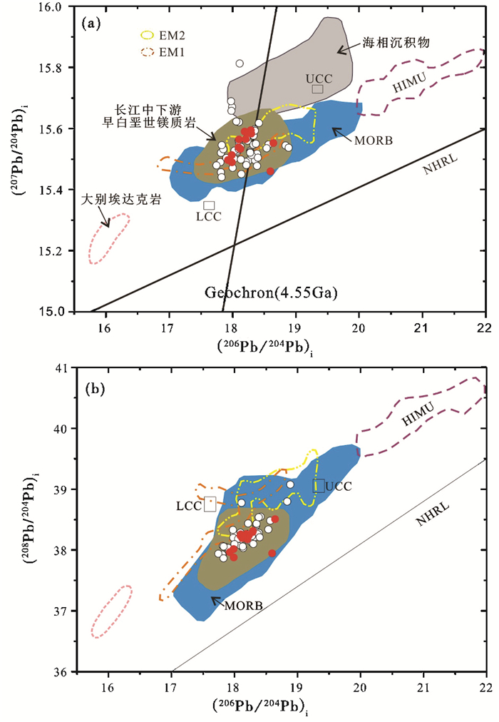 铜陵埃达克质岩Pb同位素数据见表 4,这些样品的U、Th和Pb含量变化范围分别为1.56×10-6~2.63×10-6、5.11×10-6~10.1×10-6和6.56×10-6~28.7×10-6。其Pb同位素组成变化范围分别为(206Pb/204Pb)i=17.93~18.64、(207Pb/204Pb)i=15.46~15.59、(208Pb/204Pb)i=37.88~38.51(表 4),具高放射性Pb同位素特征,均落在零等时线(Geochron) 的两侧并沿着北半球参考(NHRL) 分布,构成一个大致平行NHRL的正相关趋势,大多落在MORB区域(Hofmann,1997),近于EM1和EM2交集(Hofmann,1997),明显不同于HIMU、上、下陆壳(Hofmann,1997),与长江中下游埃达克质岩Pb同位素特征相一致(高庚等,2006;李进文等,2007;Zhou et al., 2007;Liu et al., 2010),相似于长江中下游地区早白垩世镁质侵入岩(图 6;Yan et al., 2008),而明显地高于大别埃达克岩(Huang et al., 2008),反映出其来源于洋壳而非古老下陆壳(图 6)。
