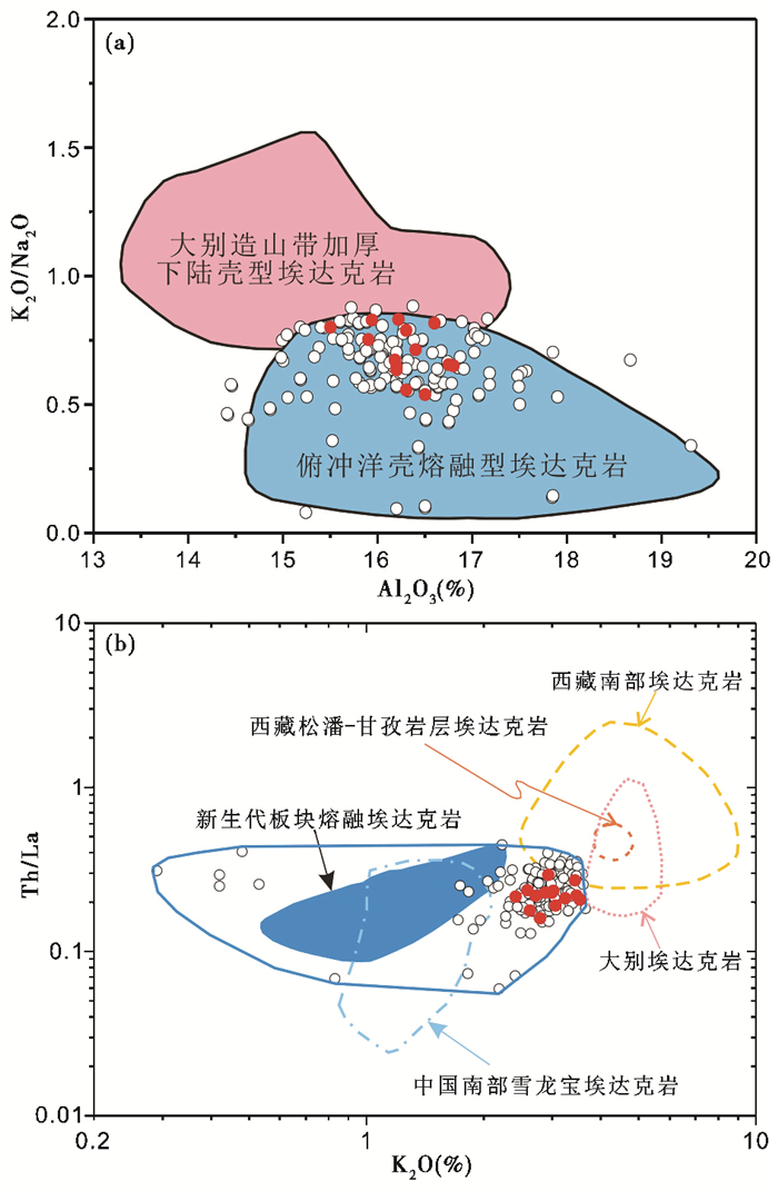 图 7 K2O/Na2O-Al2O3图解(a) 和Th/La-K2O图解(b) 数据来源:大别加厚下地壳埃达克质岩(Wang et al., 2007b;Huang et al., 2008);洋壳板块而来埃达克岩(Kamei et al., 2009);新生代板块熔融埃达克岩(Stern and Kilian, 1996);西藏南部埃达克岩(Hou et al., 2004);新生代下地壳西藏松潘-甘孜岩层埃达克岩(Wang et al., 2005);中国南部雪龙宝埃达克岩(Zhou et al., 2006);长江中下游地区埃达克质岩同图 2 Fig. 7 K2O/Na2O versus Al2O3 diagram (a) and Th/La versus K2O diagram (b) Data source: Thickened lower crust-derived adakitic rocks from the Dabie orogen (Wang et al., 2007b; Huang et al., 2008); Oceanic slab-derived adakites (Kamei et al., 2009); Cenozoic slab-derived adakites (Stern and Kilian, 1996) Potassic adakites from South Tibet (Hou et al., 2004); Cenozoic lower crust-derived adakites in the Songpa-Ganze Terrane (Wang et al., 2005); Adakites from the Xuelongbao in South China (Zhou et al., 2006); LYRB adakitic rocks are the same as in Fig. 2 |