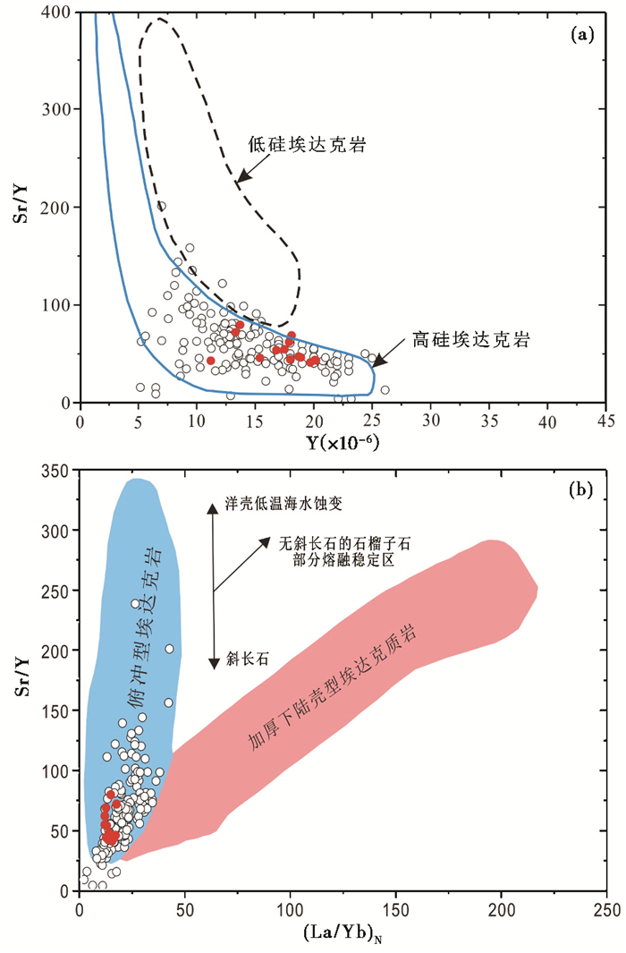 铜陵埃达克质岩样品具高Ba (>640×10-6) 和Sr含量(>483 ×10-6,平均900×10-6)、高Sr/Y (>41.3) 和(La/Yb)N(>12.1)、低Yb (1.07×10-6~2.04×10-6,平均1.73×10-6) 和Y含量(11.2×10-6~20.2×10-6,平均17.1×10-6)(表 2),与那些典型的埃达克岩特征相似(Defant and Drummond, 1990;Kay and Kay, 1993;Martin et al., 2005)。