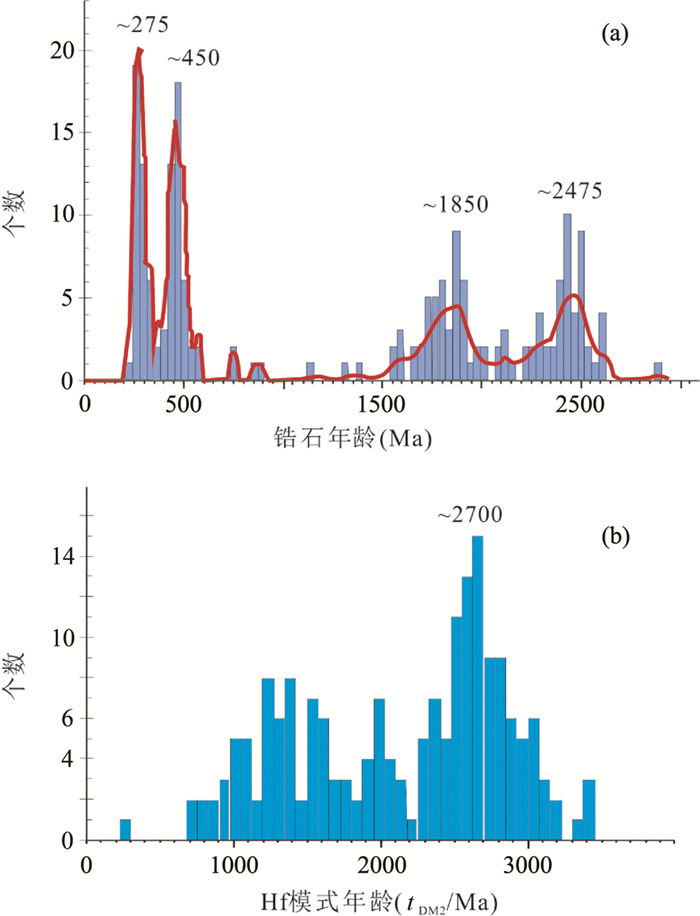 由于碎屑锆石作为沉积岩和沉积物中最稳定的副矿物,且具有较强的抗风化性和抗干扰性,我们不仅可以从中获得单颗粒锆石的U-Pb形成年龄,由此直接指示沉积岩源区地壳物质的年龄及其分布;而且由于锆石具有极低的Lu含量,极强的稳定性使其Hf同位素组成较少受到后期地质事件的影响,借此可以获得可靠的碎屑锆石寄主岩石初始的Hf同位素组成,从而获知碎屑锆石寄主岩石的岩浆源区从亏损地幔提取出来的时间(tDM),定量地获得地壳生长演化历史。因此,分析碎屑锆石的U-Pb年龄和Hf同位素组成已成为目前研究大陆地壳生长和演化最为简捷、有效的工具(Hawkesworth and Kemp, 2006a, b; Wang et al., 2009; Yang et al., 2009; Hawkesworth et al., 2010; Condie et al., 2011)。