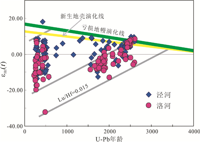 图 3 泾河和洛河河沙中碎屑锆石Hf同位素组成 其中亏损地幔演化线和新生地壳演化线分别引自Griffin et al., 2000; Dhuime et al., 2011 Fig. 3 U-Pb age versus εHf(t) value plots of detrital zircons from the Jing River and Luo River The depleted mantle evolution cure taken from Griffin et al., 2000; the new crust evolution cure taken from Dhuime et al., 2011 |