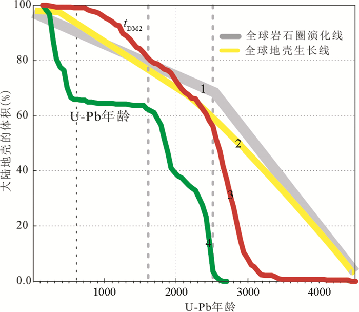 6.2 华北克拉通地壳生长 6.2.1 华北克拉通地壳生长速率以及与全球地壳演化对比为讨论华北克拉通整体地壳生长速率和演化,本文汇总泾河、洛河、滦河和永定河4个河沙样品中的381个碎屑锆石U-Pb年龄和Hf同位素数据结果,然后做各种地壳累积生长曲线。如图 4所示,根据碎屑锆石U-Pb年龄和模式年龄(tDM2) 绘制的地壳演化线存在较大差异,这主要是由于碎屑锆石U-Pb年龄只是反映源区岩浆活动期次随时间的累积分布。由该曲线可知(图 4),华北克拉通大约60%的岩浆活动发生在1.6Ga之前;而在古元古代至古生代早期(1.6~0.5Ga) 这段时间内,华北克拉通一直处于岩浆活动的沉寂期。但在早中生代, 华北克拉通又发生了大规模的岩浆活动,这可能与华北克拉通原有的稳定性遭到破坏有关(Wu et al., 2005)。由于碎屑锆石的U-Pb年龄并不能判断源区寄主岩石的形成代表的是新生地壳的形成还是古老地壳的改造,因此只有锆石Hf模式年龄可以近似代表新生地壳从亏损地幔提取的时间,也就是地壳的生长时间。由图 4所示,随着地质历史变化,华北克拉通地壳生长呈阶段性地增长。如在中太古代中期-新太古代末期(3000~2500Ma),华北克拉通的地壳生长速率较快。至新太古代末期大约已有60%现今大陆地壳形成。此后,陆壳呈较稳定速率增长,到新元古代末(600Ma),基本己形成华北克拉通现存大陆地壳。而显生宙陆壳的增生量几乎可以忽略。换而言之,显生宙华北克拉通基本没有显著的地壳生长,而是以古老地壳再循环为主。