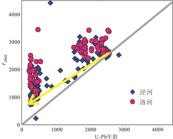 图 5 泾河和洛河河沙中碎屑锆石U-Pb对Hf同位素两阶段模式年龄图 Fig. 5 Variation of U-Pb age versus Hf model ages (tDM2) of detrital zircons from the Jing River and Luo River |