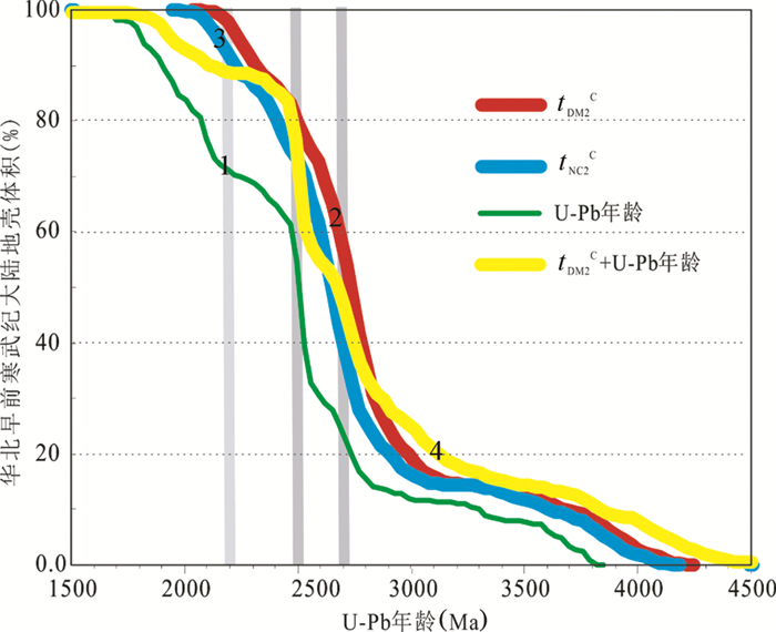 由图 4所示,及至早前寒武纪,华北克拉通与全球现今的地壳生长量基本相同,已有近80%左右的地壳形成(Belousova et al., 2010; Hawkesworth et al., 2010),表明现今大陆的绝大部分生长于太古宙和古元古代。然而,如前所述与全球地壳生长相比,华北克拉通中太古中期-新太古代末期是地壳迅速增长的时期。为进一步考察华北克拉通早前寒武纪地壳生长情况,本文又将参考文献Geng et al.(2012)汇总的古老岩石中的2553个(剔除数十个数据) 单颗锆石Hf同位素数据重新计算,然后再利用锆石U-Pb年龄和相应的亏损地幔和新生地壳模式年龄(tDM2和tNC2) 绘制华北克拉通早前寒武纪地壳演化线。由锆石U-Pb年龄的地壳演化线可知(图 6),~2.5Ga锆石约占所有前寒武纪锆石数量的40%, 这与华北克拉通西部泾河和洛河河沙(Diwu et al., 2012) 以及东部滦河和永定河河沙(Yang et al., 2009) 中碎屑锆石所记录的年龄数据统计结果一致。